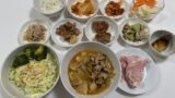 冷蔵庫の作り置きを合わせて、私のご飯はこのようになりました。食後に赤福を二つ🥰