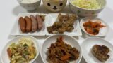 冷蔵庫の作り置きを合わせて、私のご飯はこのようになりました。食後にパンを🥰