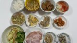 おかず作り🍳は、右手前の長崎ちゃんぽん風鍋。鶏がらスープの素、オイスターソース、塩、最後に豆乳を入れました。かまぼこ・・・は強風のため外出を諦めて、冷凍庫に残っていたあさりを消費。冷蔵庫の作り置きを合わせて、私のご飯はこのようになりました。