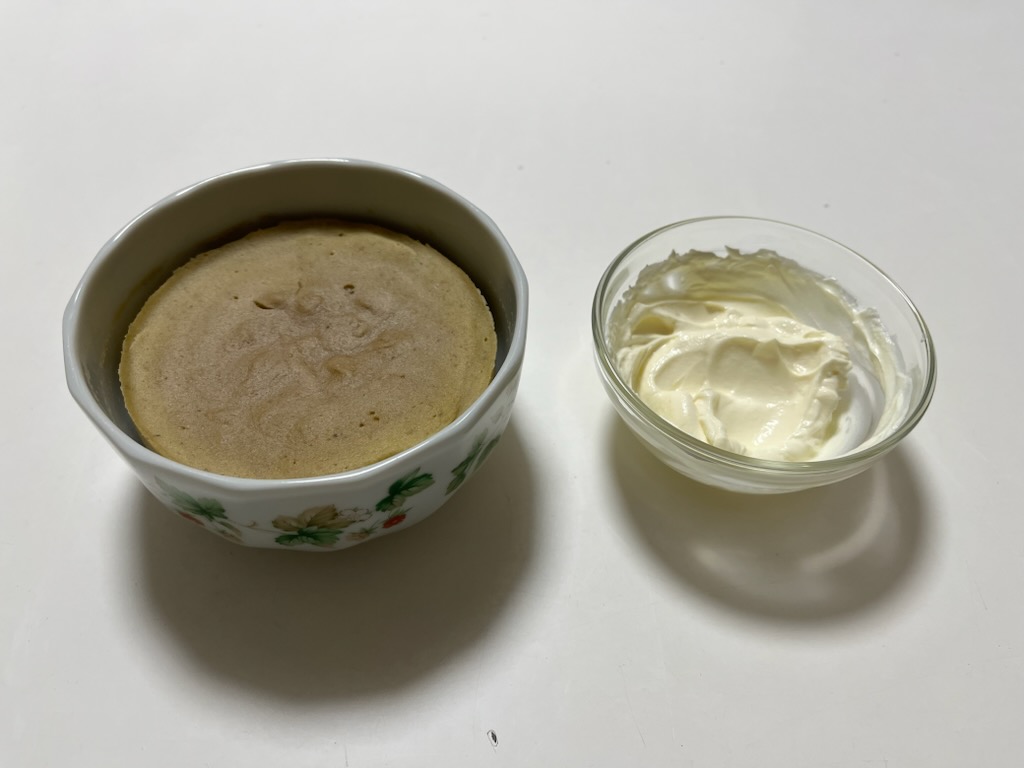 他にもクリームチーズで作れるものを探し、かぼちゃとバナナで作るレンジチーズケーキを見つけました。かぼちゃは冷凍しているので、冷蔵庫の茹でさつまいもで作ることに。砂糖を使わず、甘さはバナナだけのヘルシーケーキです。隣は、クリームチーズ+はちみつのトッピング。冷やして明日のお楽しみ♪