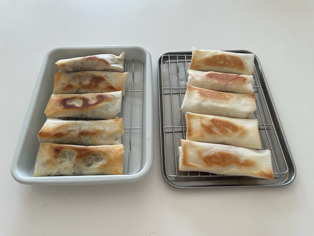 昨日作った、味の濃い青椒肉絲。キャベツとにんじんをレンジ加熱して、混ぜて味を調整。春巻きの皮で包んで、少な目の油で揚げ焼きしました。もう一種類は「海老かつ春巻き」というレシピ名の、はんぺんとかにかまの春巻き。海老かな?魚介っぽいとは思うけど・・・ふわふわでおいしいです。