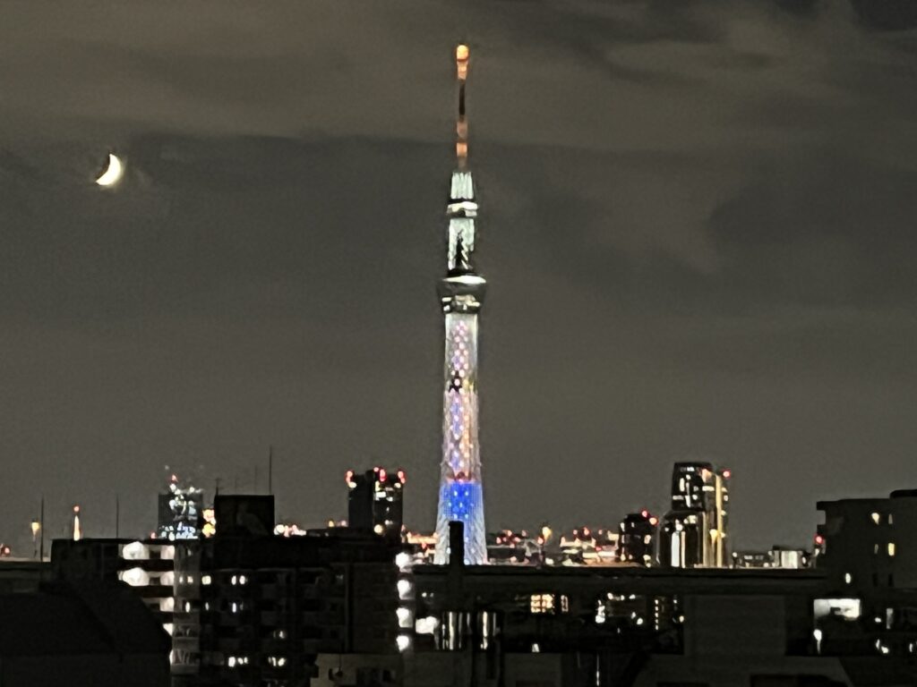 久しぶりに見た月は、西の空にいました。カラフルなスカイツリーと📷